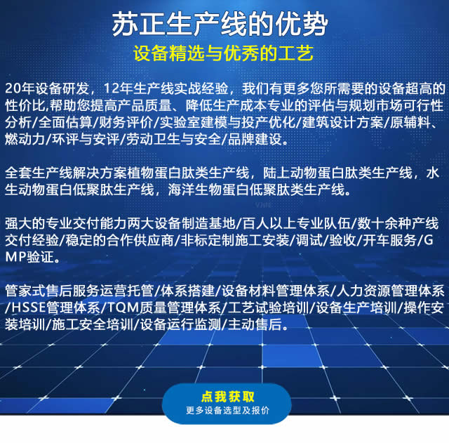 原料的質(zhì)量檢驗(yàn)、原料的前處理、熱提工段、除油工段、生物酶解工段、過(guò)濾分離、脫色過(guò)濾、濃縮工段、殺菌工段,干燥工段,軟水處理,CIP清洗系統(tǒng)等。